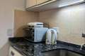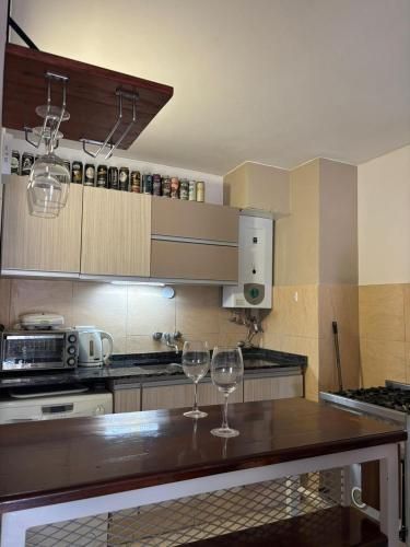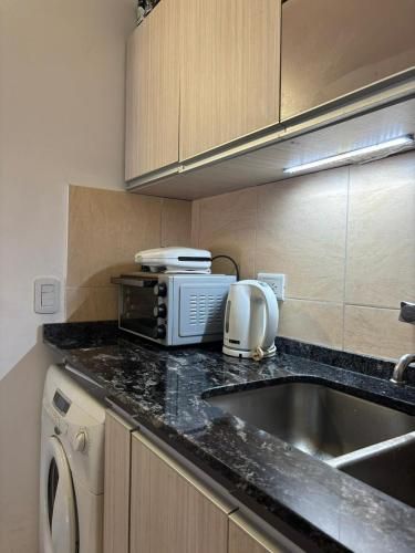 La cocina integrada dispone de barra desayunadora, muebles bajo mesada y alacena, mesada de granito y equipamiento completo que incluye cocina con horno, microondas, heladera, pava eléctrica, cafetera y vajilla. Además, el apart cuenta con lavarropas y sector de lavado, pensado para quienes buscan practicidad y autonomía durante su estadía.